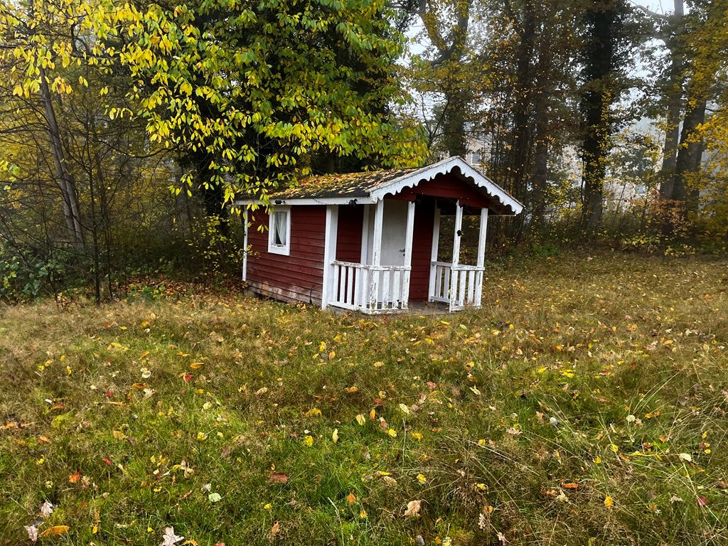 Tomtareal 848 m². Hörntomt med vildvuxen trädgårdstomt med gräsmatta, buskar och träd. Asfalterad uppfart. Stensatt gång.