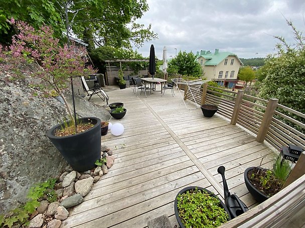 762 m², trädgårdstomt med gräsmatta, buskar och träd. Berg i dagen. Parkeringsyta med stensättning. Stödmurar.