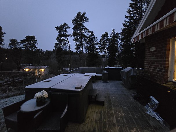Mellantomt om 1 001 m² med en kuperad trädgård. Omgivningen består av villor. På tomten finns ett uterum under tak med eldstad, en altan med ett spabad vars status är okänd samt en ovan-mark pool på den nedre gräsmattan i okänt skick.