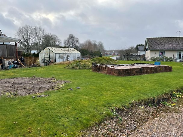 1 518 m², trädgårdstomt med grönytor och parkeringsplatser.