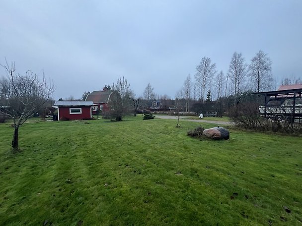 Tomt om 1 599 m² vars obebyggda delar utgörs av infartsväg, grusad parkering samt trädgård med gräsmatta, buskar och träd.