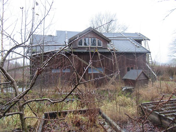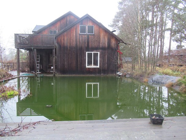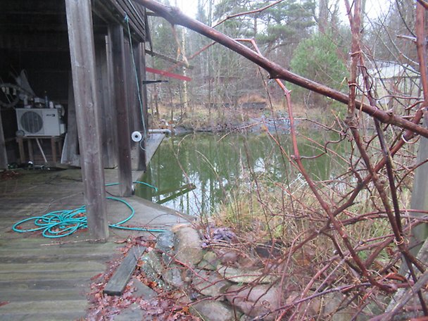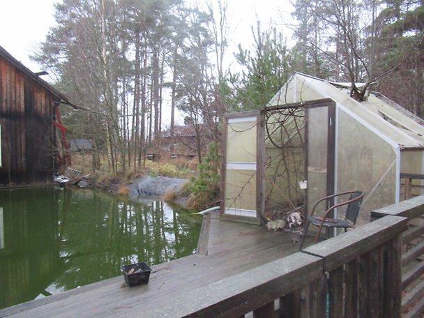 Tomt om 4 300 m², vars obebyggda delar utgörs av naturmark, träd och fiskdamm.