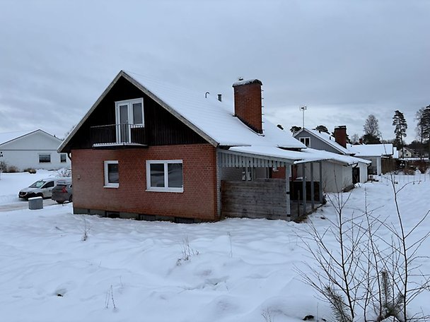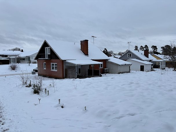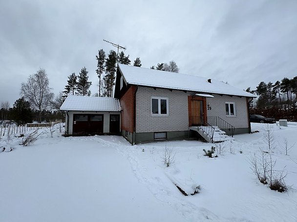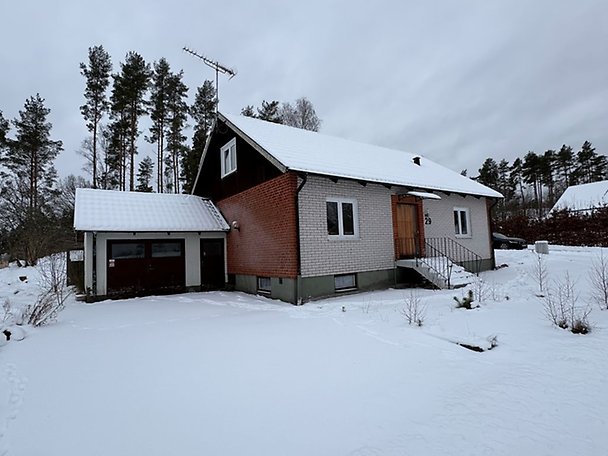 Fastighet bebyggd med ett bostadshus i 1,5-plan med källare. Bostadshuset är i behov av upprustning/renovering såväl in- som utvändigt, läs mer i Beskrivning och värdering. Uteplats om ca 12 m² med kanalplasttak. Vidbyggt garage med slagport och plats för en bil, renoveringsbehov finns. Lekstuga på tomt. Objektet är beläget i ett villaområde med närhet till fritidsområde och mindre skogsparti.