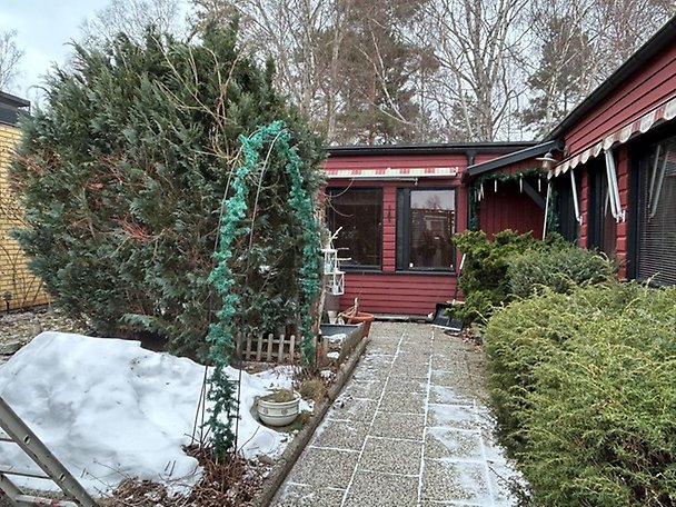Radhus i 1-plan belägen på en mellantomt i ett radhusområde. Visst renoveringsbehov föreligger såväl in- som utvändigt, läs mer i Beskrivning och värdering. Uppvärmning via fjärrvärme. Inglasat uterum. Fristående förråd i anslutning till bostadshuset. Närområdet utgörs huvudsakligen av bostadsbebyggelse bestående av radhus, kedjehus, villor och flerfamiljshus med förortskaraktär.