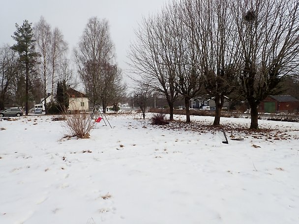 3 748 m², trädgårdstomt med gräsmatta, buskar och träd. Grusad infart