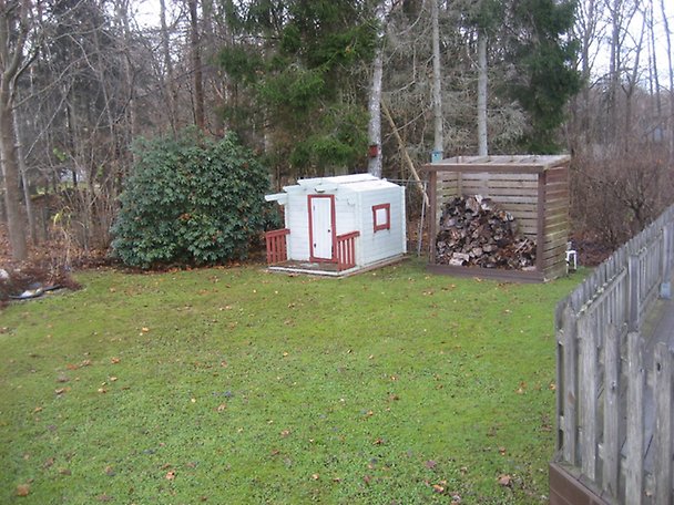 954 m², trädgårdstomt med gräsmatta, buskar och träd. Stenlagd uppfart och gångar.