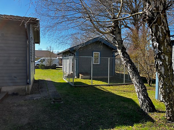 2 140 m² trädgårdstomt med gräsmatta, stenmur, buskar och träd. Stensatt gång.