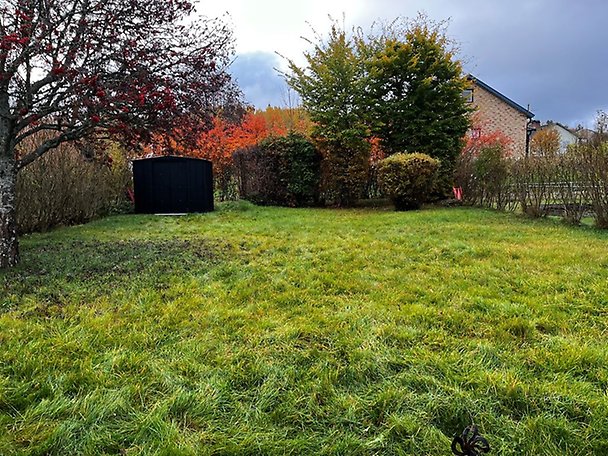 Trädgårdstomt med stensatt gång, belysning, gräsmatta, buskar och träd. Asfalterad uppfart.