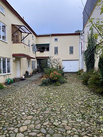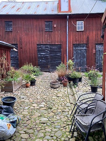 uteplats och äldre röda ekonomibyggnader (före detta brygghus och stall).