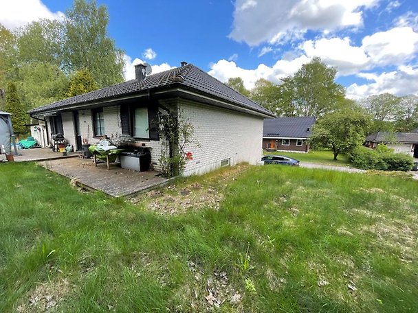 Fastighet bebyggd med ett bostadshus i 1 plan i suterräng. Delvis i originalskick med visst eftersatt underhåll, läs mer i Beskrivning och värdering. Garage i bottenplan. Uteplats med trädäck. Närområdet består i huvudsak av småhusbebyggelse.