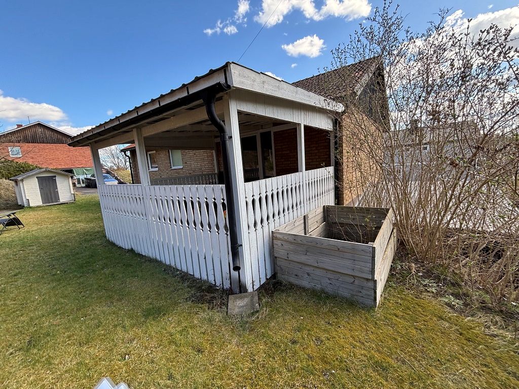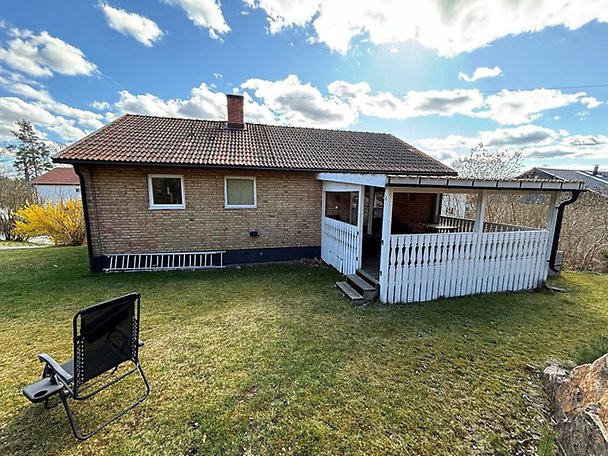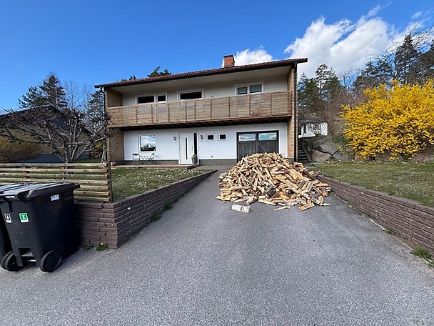 Villa i 1-plan med sluttningsvåning och en bostadsarea och biutrymme 100 resp 44 m². Nedre våningen renoverad med nya ytskikt 2019. Balkong längs hel långsida. Vitmålad lekstuga i normalt skicka. Öppen altan med trallgolv och plåttak. Integrerat garage med ingång via bottenvåning alternativt dubbelportar utifrån. Objektet är beläget i villaområde.