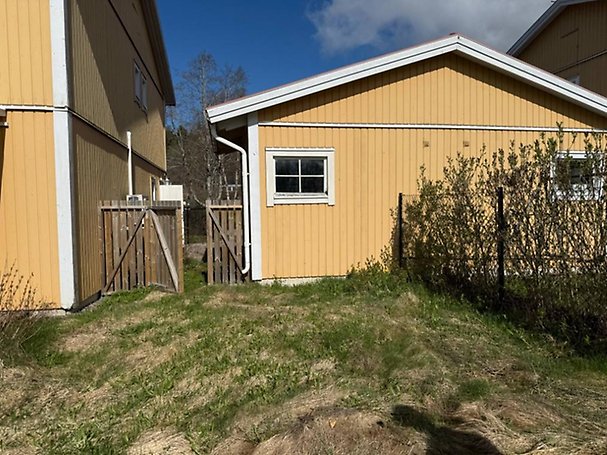 Tomt om 369 m² vars obebyggda delar utgörs av inghägnad trädgård och bevuxen gräsmatta och grusad infart/parkering.